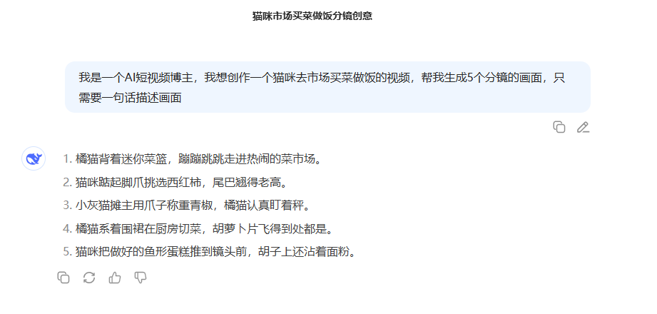 第一步:准备故事创意打开DeepSeek网站:https://chat.deepseek.com/输入提示词要求AI生成故事分镜例如:”我是一个AI短视频博主,我想创作一个猫咪去市场买菜做饭的视频,帮我生成5个分镜的画面,只需要一句话描述画面”